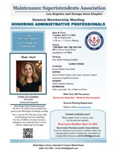 April has long been the MSA’s meeting month, during which supervisors, managers, and executive directors could show their administrative professional staff their appreciation for their valuable support that makes them look good. Our Chapter will observe its annual Administrative Professional’s Day on April 14th, 2026. We will enjoy a delicious meal at “The Reef On The Water” restaurant in Long Beach. The event cost is $50 per person and will undoubtedly be memorable for your staff members because of the venue, delicious meals, and entertainment.